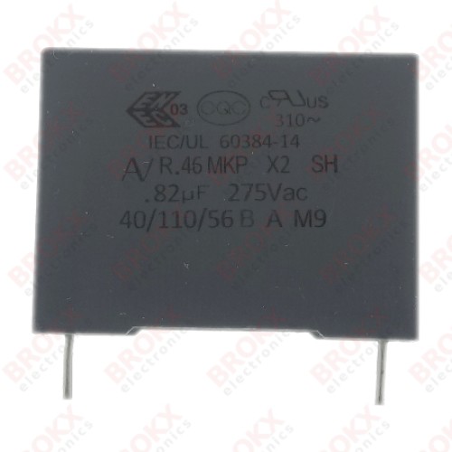 polypropyleen condensator - 0,820 uF 275 VAC - steek 22,5 mm - 10% tolerantie - 26,5 x 11 x 20 mm