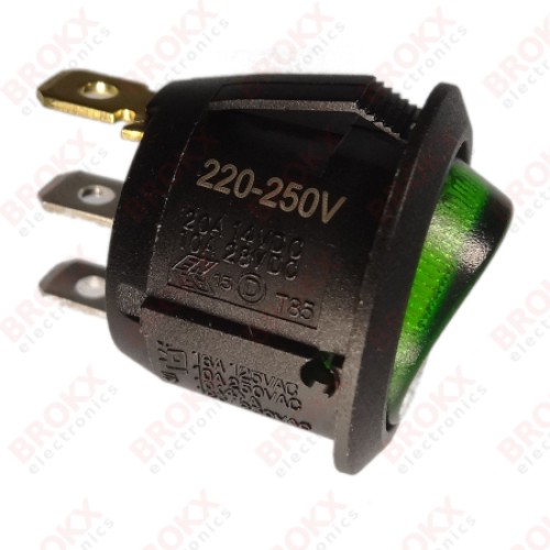 Tuimel schakelaar - AAN-UIT enkelvoudig contact(SPST) - 2-posities - max AC contact belasting 10 A / 250 VAC - Tuimelaar kleur groen - Behuizing kleur zwart - max DC contact belasting 10 A / 24 VDC - RoHS compliant