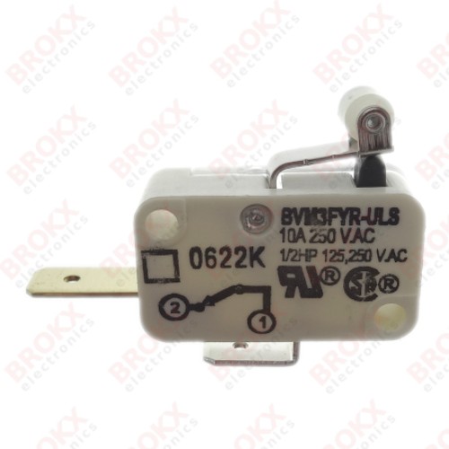 Microswitch - Verbreek contact (SPST-NC) - max AC belasting 10A / 250V - IP40 - hefboom lengte 11,7mm - mechanische duurzaamheid 1000000 cycles - Microswitch behuizing maten 28 x 10,5 x 16mm - 6,3 x 0,8 connectors - temperatuur bereik -40...85ºC - RoHS compliant