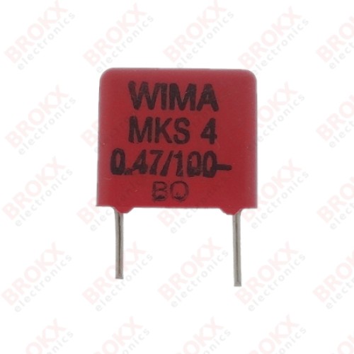 polyester condensator - 470 nF 100V - steek 7,5 mm - 10% tolerantie - 6 x 12 x 10,5 mm - temperatuur bereik -55 tot 105 °C - RoHS compliant