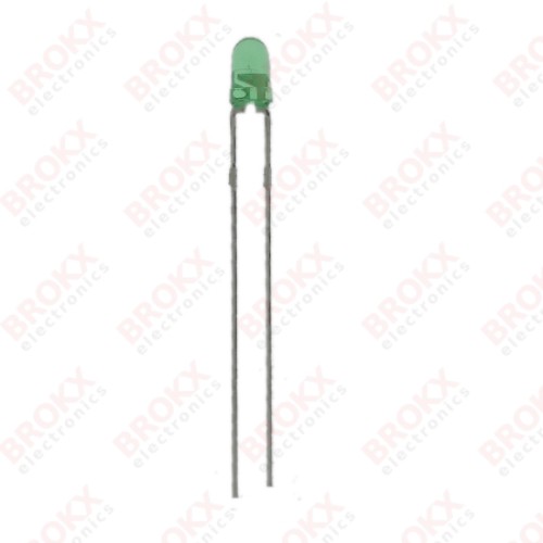 diameter 3 mm - 2,1 V 10 mA - helderheid 20-60 mcd - max inkijk hoek 50º - kleur groen - golflengte 568 nm - steek 2,54 mm - RoHS compliant