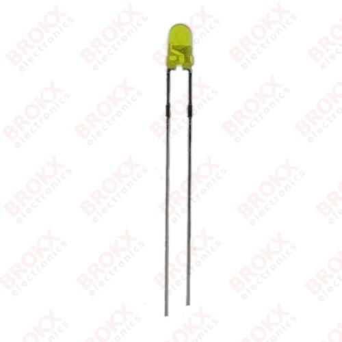 diameter 3 mm - 2 V 10 mA - helderheid 10-50 mcd - max inkijk hoek 50º - kleur geel - golflengte 590 nm - steek 2,54 mm - RoHS compliant